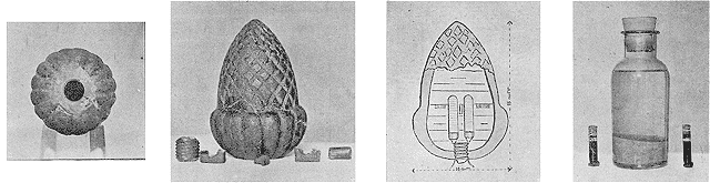 | Culot de la «pomme de pin» ou boule d'escalier, en fonte creuse. | La «pomme de pin», avec les boulons et les écrous de fermeture. | Coupe montrant la disposition intérieure. | Les explosifs: dans les tubes, l'acide sulfurique; au fond du flacon, le fulminate de mercure, noyé dans l'eau. |