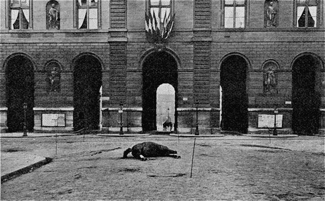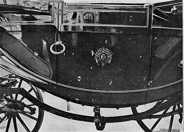 | Le capitaine Schneider atteint par les projectiles à la portière gauche du landau royal et dont le cheval a été grièvement blessé. |