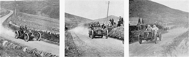 Douze concurrents anglais se sont disputé, le 30 mai, dans l'île de Man, l'honneur de venir participer à la grande épreuve internationale de la coupe Gordon-Bennett qui doit avoir lieu, comme on peut s'en souvenir, sur le parcours accidenté du circuit d'Auvergne, le 5 juillet prochain. Trois d'entre eux seulement ont terminé les 492 kilomètres du circuit éliminatoire, à une vitesse allant de 58 à 62 kilomètres de moyenne à l'heure; ce sont les trois concurrents dont nous reproduisons des photographies. Les neuf autres voitures ont été, ou arrêtées par de simples pannes, ou brisées--tout au moins détériorées--dans des virages trop rapides.