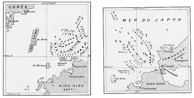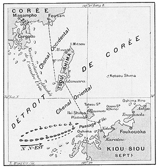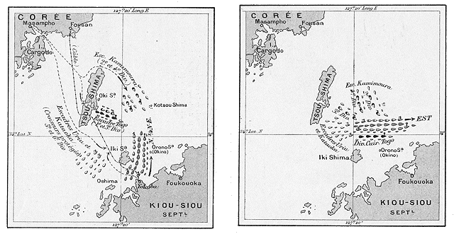 I.--27 mai, 6 heures du matin Rojestvensky arrive au détroit de Corée. Le 27 mai, à 6 heures du matin, la flotte russe avance en deux colonnes, le croiseur-éclaireur Zemtschoug en tête. La colonne de droite, conduite par le Kniaz-Souvarof (amiral Rojestvensky), comprend les 7 autres cuirassés (dans l'ordre: le Borodino, l'Orel, l'Alexandre-III, l'Osliabia, le Sissoi-Veliky, le Navarin, le Nicolas-Ier), plus 5 transports. La colonne de gauche comprend 3 croiseurs-cuirassés, 3 gardes-côtes et 5 croiseurs protégés. Huit contre-torpilleurs accompagnent l'escadre, à l'abri des cuirassés. Craignant les forts de Tsou-Shima, l'escadre passe entre Iki et la côte de Kiou-Siou. A cette heure, l'amiral Togo se tenait à Masampho.