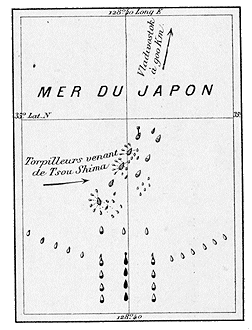 VI.--27-28 mai: l'attaque nocturne des torpilleurs. Les torpilleurs et contre-torpilleurs japonais entrent en scène. Venant de Tsou-Shima, ils s'abattent, «comme un vol de guêpes», sur les cuirassés russes. Les gros navires japonais, en formation d'enveloppement éclairent de tous leurs projecteurs cette attaque. L'Alexandre-III, le Sissoi-Veliky et le Navarin sont coulés. Le Nicolas-Ier (Nebogatof), l'Orel et les trois gardes-côtes s'échappent encore vers le nord.