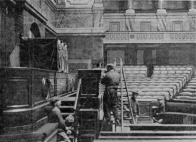 Dans la salle, les sièges ont été recouverts de cuir jaune foncé. Les membres des deux Chambres s'assoient, sans places marquées, au hasard, ou plutôt, si l'on peut dire, suivant leurs affinités électives.