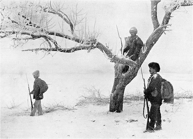Les Serbes, pendant la trêve des négociations, demeurent en Albanie, sur ces positions que leur disputent actuellement non plus les Turcs, mais les diplomates. C'est l'hiver! C'est la neige qui, peu à peu, ensevelit les cantonnements et les équipages, cependant que çà et là, vigilantes sentinelles, les auxiliaires macédoniens, qui connaissent si bien toutes les ruses de la guerre de surprises, protègent les postes serbes contre un coup de main toujours possible, malgré l'armistice, des bandes albanaises.