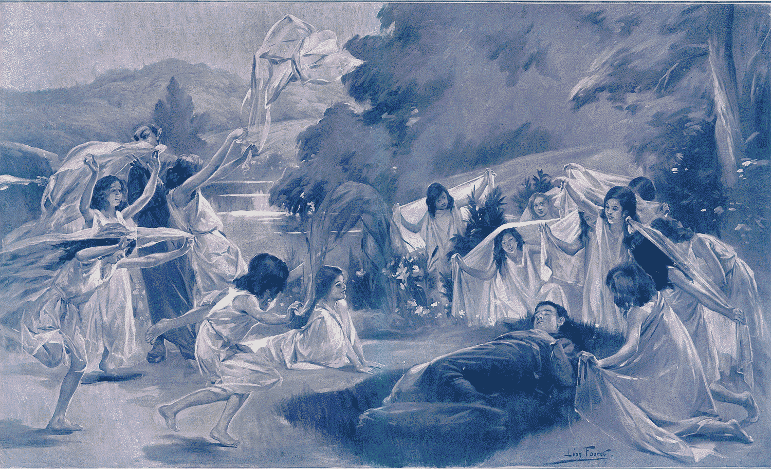 Et c'est ainsi surtout qu'après la très belle scène de la prison d'où s'élève l'horreur d'une intense suggestion tragique, nos yeux ont la joie reposante de voir s'exécuter, dans un décor miraculeux de calme et de jeune verdure, la ronde exquise que les Sylphes dansent autour de Faust endormi. On connaîtra par l'image que publie L'Illustration quelle charmante poésie se dégage à première vue de ce palpitement d'ailes de gaze sur l'accablement du Héros. Les jeunes élèves de Loïe Fuller ont réalisé avec la plus grande saveur ce merveilleux enchantement. Elles ont juste la candeur qu'il faut, le lyrisme instinctif, la grâce fragile,--et la science qu'une glorieuse direction leur a très habilement inculquée.