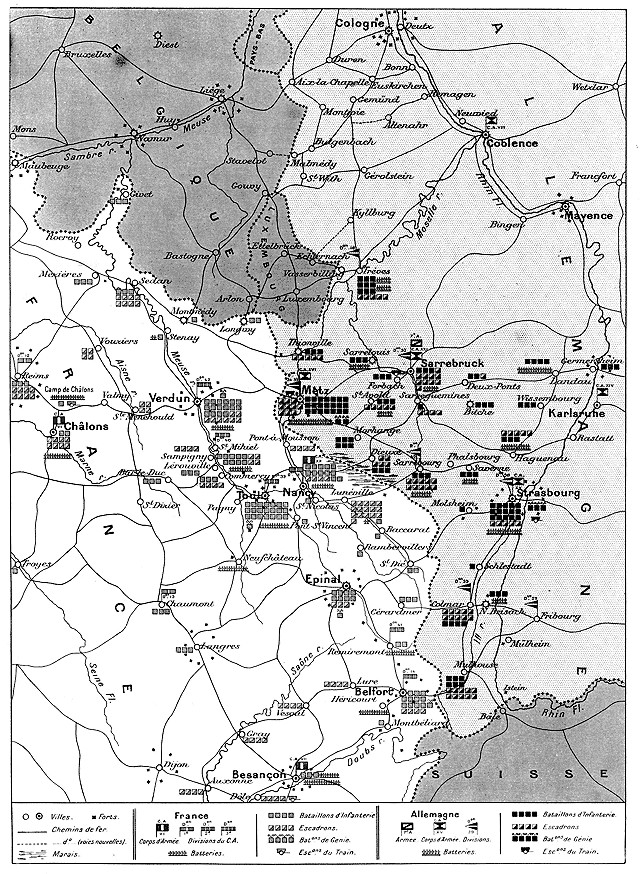 Les voies nouvelles, indiquées sur la carte et qui seront achevées prochainement, ont pour objet de relier le Rhin à la frontière belge et au Luxembourg; d'après les Allemands eux-mêmes, elles pourraient assurer les transports de 6 à 7 corps d'armée.