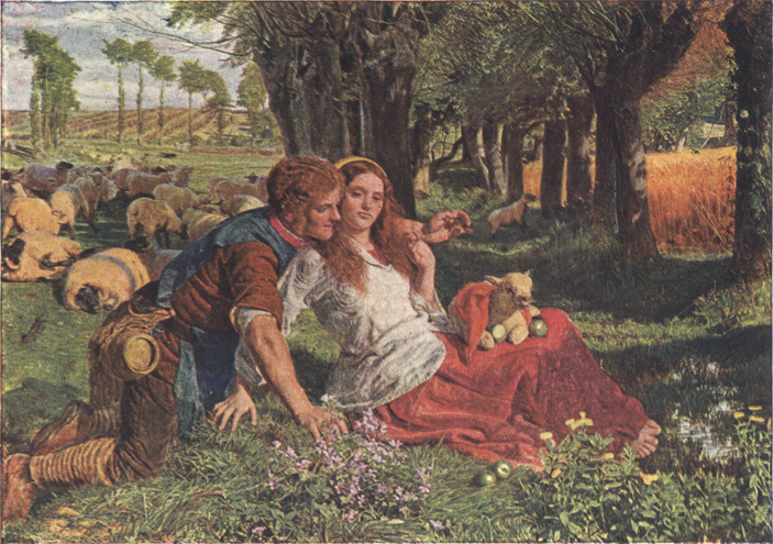 It is not an actual shepherd and shepherdess who are seated in this leafy English landscape, among the green pastures and by the still waters. Still less is it the kind of shepherd and shepherdess that Watteau, Fragonard, and the china manufactory of Dresden have accustomed us to associate with the words. Who and what are they, those careless people in the bright sunshine, letting the sheep eat the corn that kills them and the unripe apples? The shepherd’s crook lies idle on the ground. He has found a death’s-head moth; he is too busy showing it to his companion to have any use for that. She is flattered and pleased that he should attend to her rather than to the sheep.[68]