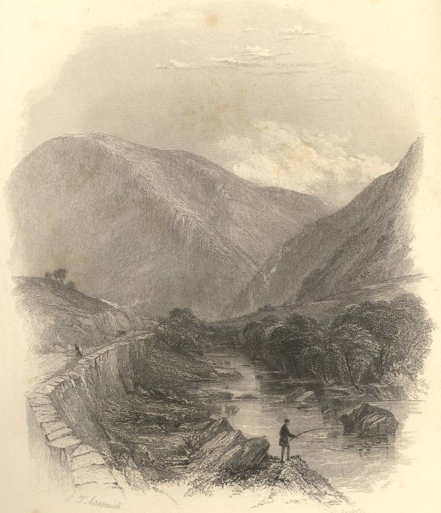 Leaving Stedva Gerrig, the road runs by the side of the stream before mentioned, through a succession of mountain valleys, which, being without the grandiose forms of the view from Plinlimmon, are uninteresting from the want of trees. On the left there was a wreath of grey smoke flying backward on the wind, from the brow of the steep which forms the side of the valley; and we speculated within ourselves as to whether this was the ensign of p. 18some unlawful still. It proved, however, to be the foam of a little mountain torrent, caught suddenly by the gust ere it reached the edge of the precipice; and so complete was the illusion, that it was not till we had climbed to the spot, that we were convinced of the phenomenon being the production of water instead of fire.