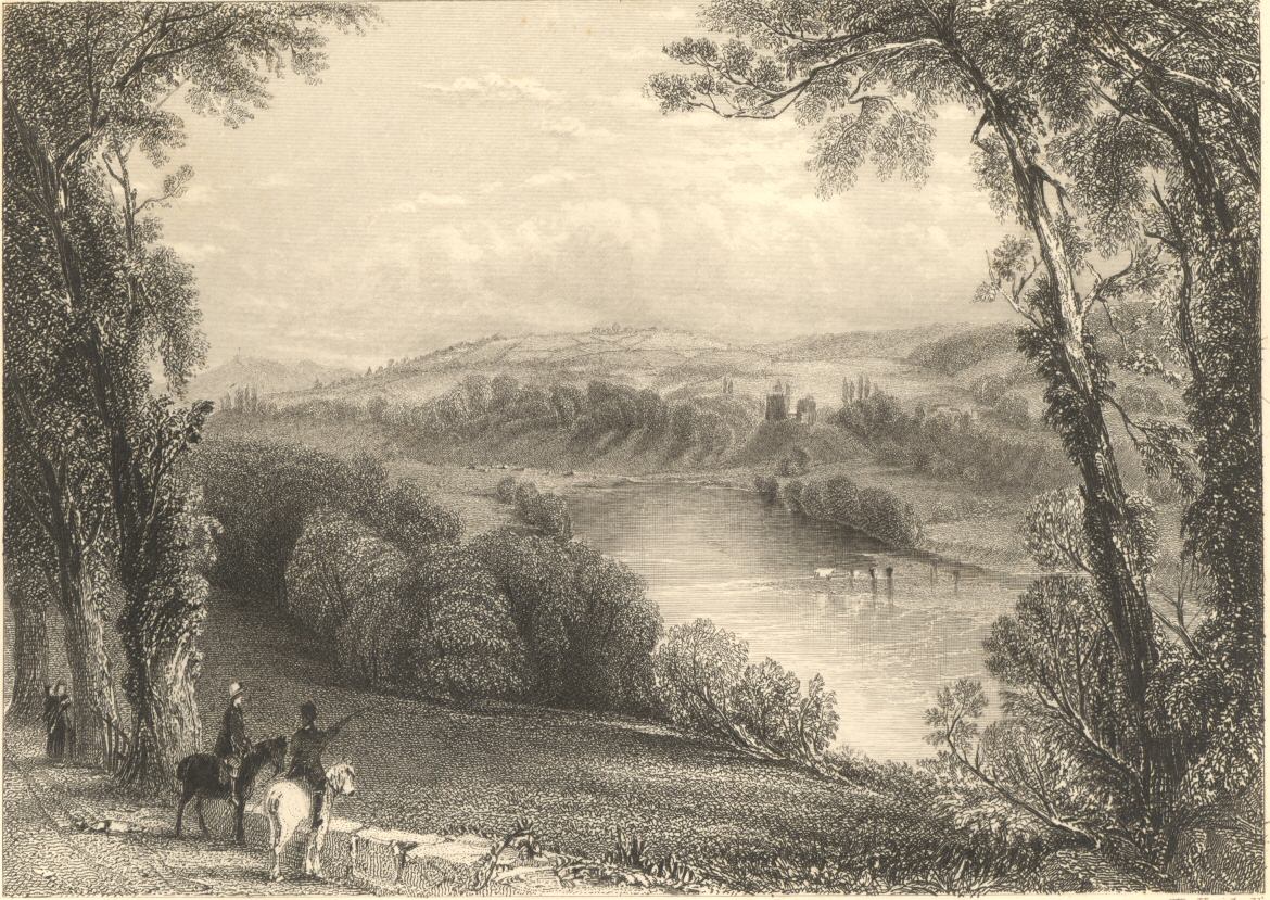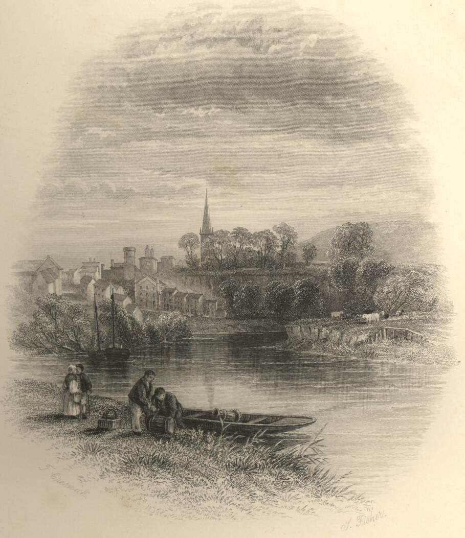 The small village of Glasbury presents a view well worth notice. This is particularly the case at Maeslough Hall, where Gilpin characterises the scenery as “wonderfully amusing,” declaring that the situation is one of the finest in Wales. On passing the seventh milestone, the valley spreads out into a wide plain bounded by an amphitheatre of hills; and as we proceed, numerous villas peeping through the trees, show that we have now left entirely behind us the peculiarities of Welsh scenery, and are again on the borders of merry England. As we p. 28approach the Hay, the aristocratical buildings become more numerous, and the romance of the scene diminishes, till at length we enter a small, but neat and comfortable-looking town.