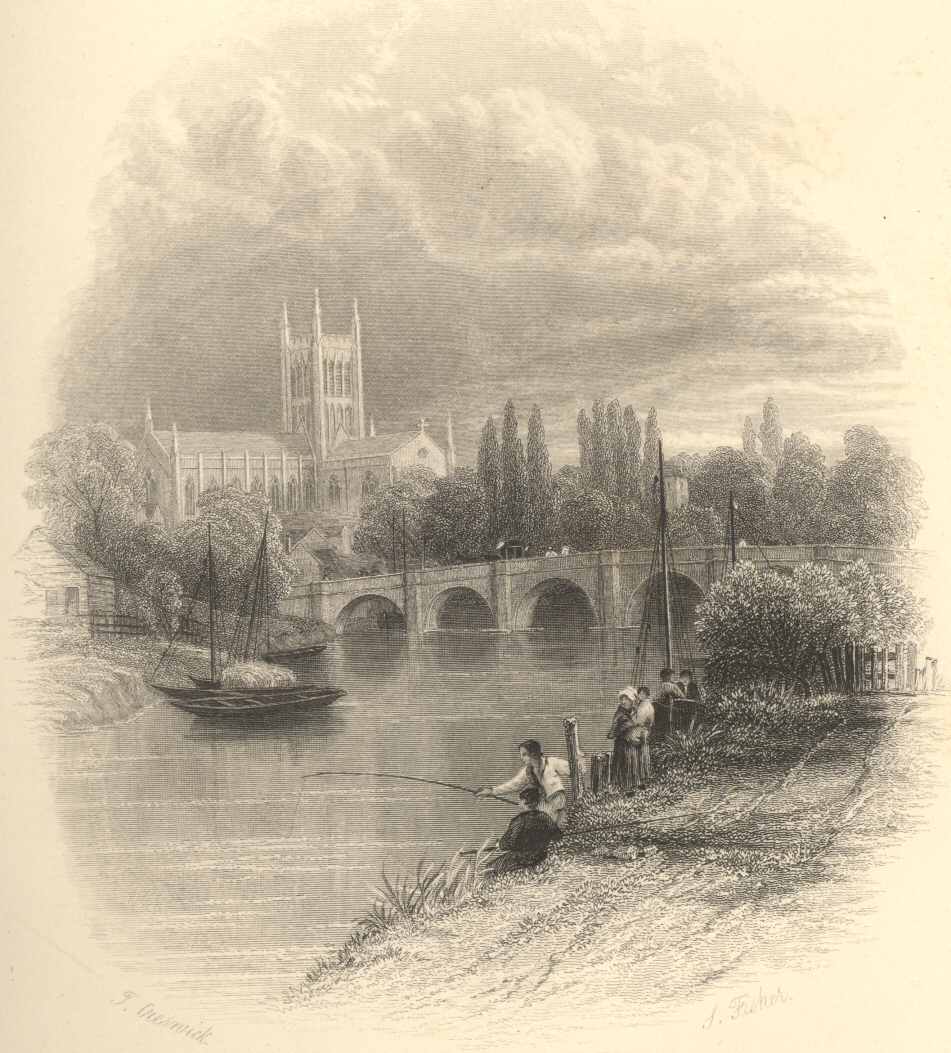 Worcester is one of the most aristocratic looking towns in England, and presents every token of being a wealthy and flourishing place. Its cathedral, an edifice of the beginning of the thirteenth century, has drawn hither many a pilgrim foot even from foreign countries. Our present business, however, is with the works of nature, or with those of art fallen into decay, and their fragments standing amidst the eternal youth of the hills and rivers, like monuments of the insignificance of man.