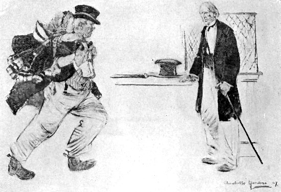 Jonas stalked out of the room pretending to be very angry, but he began to chuckle as soon as his back was turned. "Sanders is out of his sphere," he said to himself. "More than half the time he should have a big tent over his head and be rigged up like a clown." Mr. Sanders watched the door through which old Jonas had gone, as if he expected him to come back. Then he called out to him: "Jonas! be shore to have somethin' for supper that me an' that child can eat!"