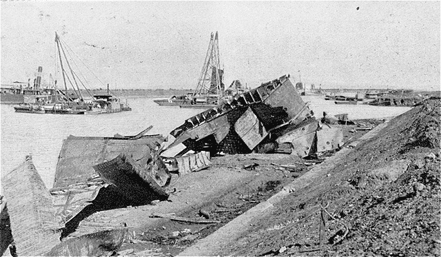 On se rappelle que le navire anglais Chatham, en partie chargé de dynamite, ayant pris feu au cours de son passage dans le canal de Suez, fut aussitôt coulé, par mesure de prudence. Trois semaines plus tard, le 28 septembre, on détruisait l'épave par une explosion minutieusement préparée. Dans notre numéro du 14 octobre dernier, à côté de photographies instantanées faisant voir la gerbe de l'explosion et les phénomènes de remous des eaux et d'obscurcissement du ciel qui l'accompagnèrent, une de nos gravures présentait les «bigues» occupées à débarrasser le canal des débris du Chatham. Nous montrons aujourd'hui les plus gros de ces débris que les puissantes machines ont réussi à amener sur la berge.