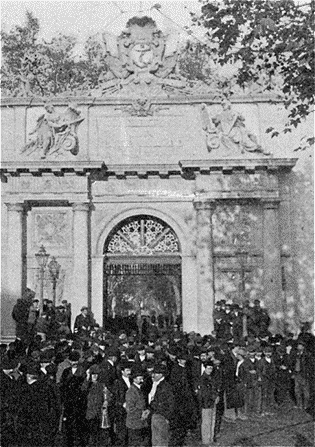 Le pouvoir a espéré que l'octroi, par lui, au peuple russe, des libertés essentielles allait soulever dans l'empire entier une explosion d'allégresse. Il a provoqué, invité la foule à la joie. Des illuminations ont été préparées partout. A Odessa, par exemple, où fut prise la photographie ci-dessus, le blason impérial, que surmonte le premier vers de l'hymne impérial, voeu et prière, Boje Tsara kram, est prêt à illuminer de son aigle de feu le péristyle de la Douma. Mais les agitateurs l'ont entendu autrement. Il leur faut plus encore qu'on ne leur promet, qu'on ne leur donne, et ce premier succès les enhardit. Une foule se rue vers la Douma, parée pour la fête. Plus d'illuminations. Boje, Tsara les deux premiers mots de l'inscription, le nom de Dieu, celui de l'empereur, sont arrachés, brisés, et, dans la carcasse métallique des armoiries, des orateurs grimpent pour haranguer les manifestants et les exciter à la révolte.