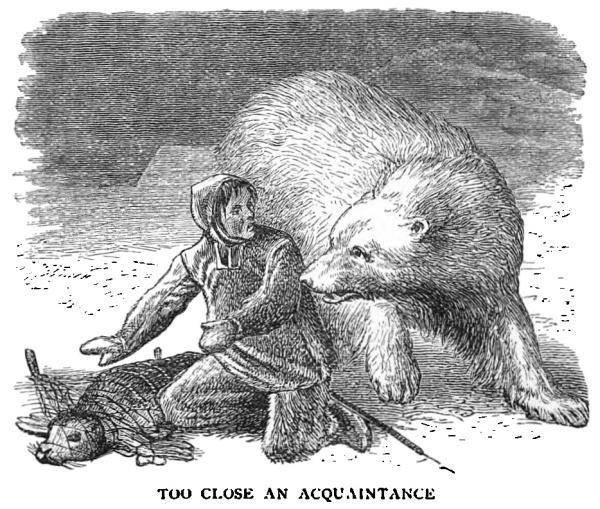 “Yet I, for one, could not help contrasting my present position with what it would have been at home in old England. How different it was here! yet the very difference made it quite charming. Suppose that you had stood on the deck of our brave yacht and looked around; you would have seen that the whole bay was frozen over with thick black ice. No need for boats now, we could skate to the shore. Behind us, seaward, across the month of the bay, stretched a rugged wall of serrated icebergs; on each side of the bay were the ice-clad rocks; shoreward, as you turned your eye, there was first the Innuit village, then the land rose gradually upwards, a snow-clad valley rock-bound, till, in the far distance, behold a vast, towering mountain of ice.