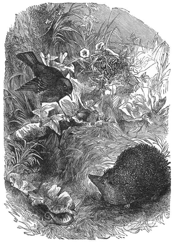 It would be difficult to give the reader any very definite idea of the appearance of our cottage outside or inside. Though not very far from the village, it was so buried in trees of every sort—elms, oaks, lindens, chestnuts, pines, and poplars—that no photographer, or artist either, could ever sketch it. Much less can I. But just imagine to yourself all kinds of pretty shrubberies, and half-wild lawns, and rustic rose-clad arches, and quaint old gables, and verandahs over which the sweet-scented mauve wistaria fell in clusters in spring, when the yellow laburnum and the lilacs were in bloom. Let flowers peep out from every corner and nook—the snowdrop, the crocus, daffodil and primrose in April, with wild flowers on the lawns in summer, and syringas and roses even in the hedges; and people the whole place with birds of every size, from the modest wee wren or little tit to the speckled mavis and orange-billed blackbird, that sang every morning to welcome the sunrise; let wild pigeons croodle among the ivy that creeps around the poplar-trees, and nightingales make spring nights melodious; and imagine also all kind of coaxing walks, that seemed to lead everywhere, but never land one anywhere in particular; and you will have some faint notion what Rowan-Tree Cottage was like.