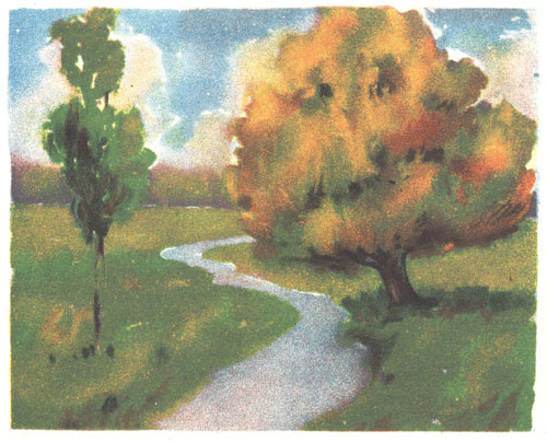 Study the sketch on this page. Then paint an autumn picture. Show a bright blue sky, a field or hillside,—once green, but now touched with russet and brown,—a path or a pool of water, distant foliage, and one large tree. Save your picture to use in another lesson.