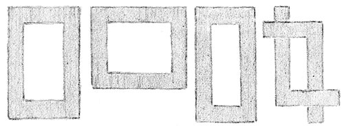 Draw four squares, each four inches on a side. Divide each into large and small spaces of pleasing variety by using vertical and horizontal lines, four inches in length.