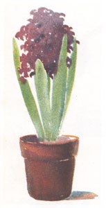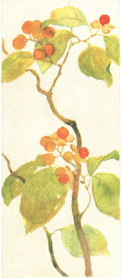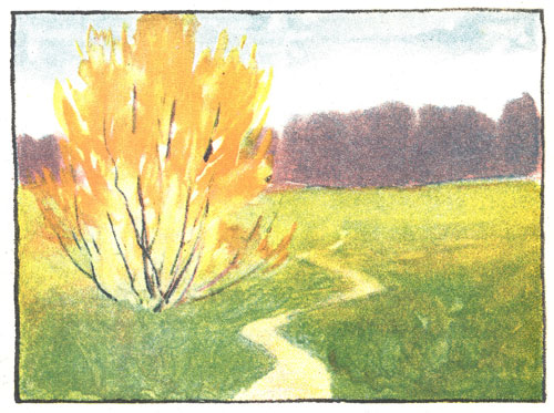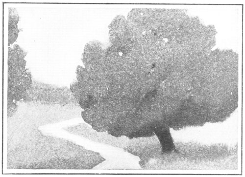 Choose some flowering tree or shrub to paint in a picture. In painting a landscape like the one on this page, one good way is first to draw with a brush line and very light violet color, the shapes that must be carefully placed. Then add the sky and foreground washes and drop on the damp paper the colors you see in the bush or tree. Draw the trunk of the tree, or the branches of the shrub, in dark gray-violet. A path or road may be wiped out of the foreground with the nearly dry brush, and a little red and yellow added to give the color of sandy ground.