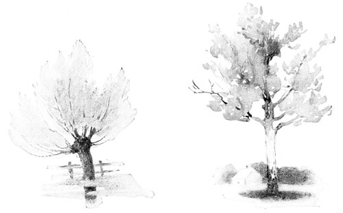 The pictures on this page tell you plainly that the willow and the sycamore, or buttonwood tree, were chosen for the sketches, yet not a single leaf is shown as you would see it if you held it in your hand. What is it, then, that tells the story? It is the truthful drawing of the big things—the shape of the mass of foliage, the height and width of the trunk below the boughs, the size and direction of the branches, and the way they grow from the trunk.