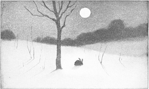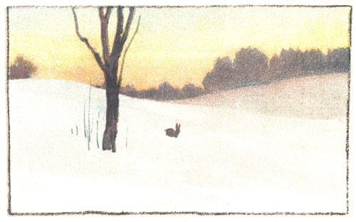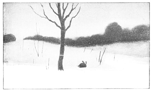 Here is our winter sunset, shown in values. You will remember that by values we mean the different degrees of light and dark used to express color. Compare the two sunset pictures. The light gray-violet of the snow is shown in a light gray or neutral value in the picture on this page. The trees are very much darker, and the sky is neither as light as the snow nor as dark as the trees. The little rabbit makes a dark spot in the snow, and the foreground—that part of the picture that seems to be nearest—is white. You see that it has taken about four values to express the colors seen.