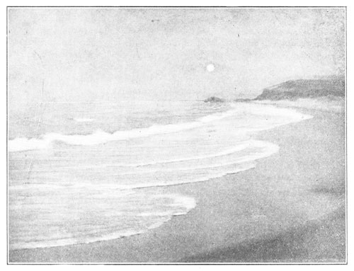 Notice, too, the arrangement of values—the light foam, the darker sky and ocean, the wet sand, and the solid mainland. Only four things are shown—sky, moon, sea, and shore—but they are so drawn as to give the necessary variety.