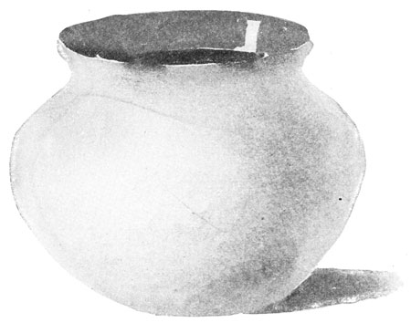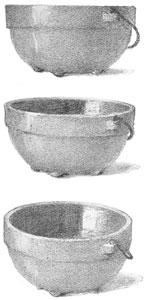 After drawing such a design, the next step is to make the bowl of clay. For the bowl represented here, a lump of clay was rolled and patted into a low, roughly shaped cylinder. The thumbs were then thrust into the middle of the cylinder, and they, together with the fingers, pushed the clay outward to form the bottom and part of the sides of the bowl. The sides were finished by adding flat pieces of clay, their edges being carefully worked until the pieces added seemed a part of the form. The sides and bottom of the bowl were kept of uniform thickness. Then the bowl was allowed to stand about a day, or until it became what is called "leather hard." The border was then painted on with potter's colors, the lower part of the bowl was colored, and the inside glazed. The bowl was again allowed to dry, this time very thoroughly. It was then fired in a potter's kiln.