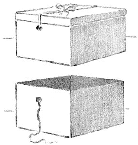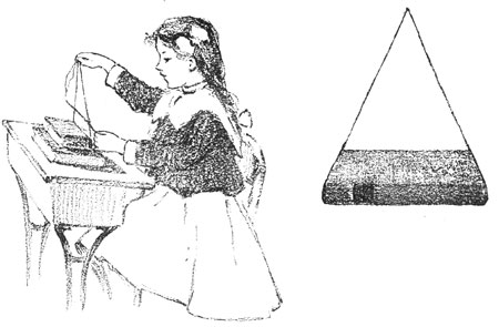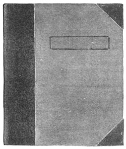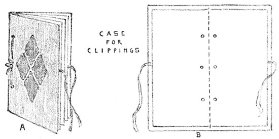 To make the case for newspaper clippings shown on this page, cut an oblong of stiff manila paper, 8 ½ × 9 ½ inches. Use your test square in measuring all corners, to get right angles. Then cut an oblong 9 ½ × 10 ½ inches of "cover" paper, of some good color. Fit the manila oblong within this, in such a way as to leave an inch margin of colored paper all around it. Fold over this margin, pasting it down neatly. Cut an oblong 8 ¼ × 9 ¼ inches, of tinted paper of lighter weight. Lay this oblong as an inside lining to the cover, pasting to leave a narrow margin of the dark cover paper around the lining. Place the cover on your desk, with the long edges from left to right. Fold the nearer edge to meet the farther edge. Crease well. Bisect the crease, and place a point 3⁄8 of an inch up from the crease. Measure three inches from each end, and place points at these distances, 3⁄8 of an inch up from the crease. Within the folded cover, place six or eight No. 9 envelopes, the bottom edges of the envelopes touching the crease. Fit the envelopes within the cover, to leave an equal margin around the front and ends of the case. Holding the envelopes firmly within the cover, make holes with an eyelet punch at the points placed for them. Tie the envelopes in the case with raffia, tape, or cord.