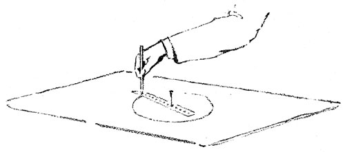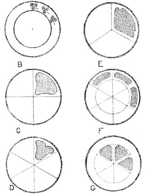 In Sketch B diameters are drawn and in the center is a small square on its diagonals. Little pathways lead from the sides of the square to the center, resulting in a four-sided decoration. In Sketch C diagonals are drawn and pathways sent along them to the center. Sketches D, E, and F are like A, B, and C, except that curved lines have been used instead of straight lines.