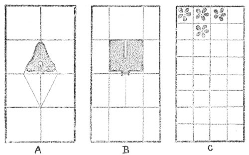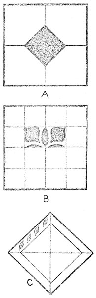 Sketch C shows a plan for dividing the oblong into many small squares. In each of these, or in every other one, a simple unit could be placed, to make an "all-over" pattern.