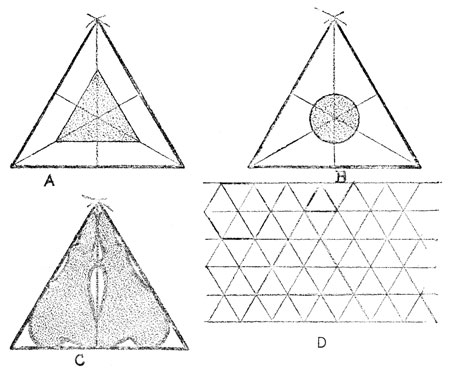 Sketches A and B show you how an equilateral triangle may be divided. Sketch C shows how one line may divide the triangle into two shapes, whose outlines may be slightly changed or modified, to make a decoration.