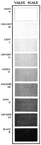 The Neutral Value Scale. In Chart D the scales are arranged to show the grays or neutral values that correspond to the different colors in their full intensity. In this chart yellow is as light as the gray wash called High Light (HL). Yellow-orange and yellow-green are of the same value as Light (L). Orange and green are of the same value as Low Light (LL). Red-orange and blue-green are of the same value as Middle (M). Red and blue equal the neutral value High Dark (HD). Red-violet and blue-violet are equal to Dark (D), and violet, the darkest color, is expressed by Low Dark (LD). Low Dark is almost black.