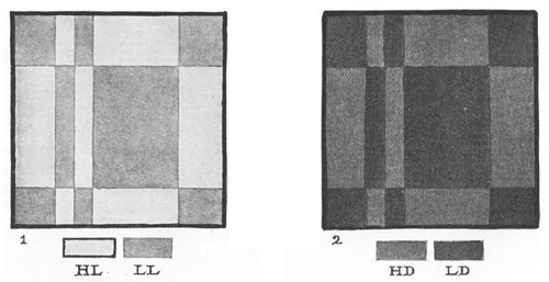 Draw two four-inch squares and divide them alike into large and small spaces. Using two values, paint one in a high key, and the other in a low key. Make a little scale under each sketch, naming the values you have used.