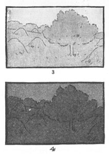 Sketches 1 and 2 show you how different the same design appears, when painted in different keys. Sketch 3 is a landscape in the same values used in Sketch 1. Sketch 4 shows the same scene in a lower key. The soft, silvery light of early morning has given place to the deeper tones of dusk.