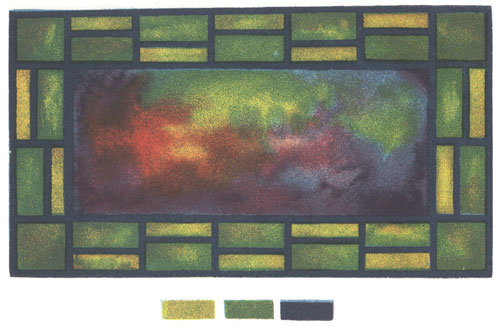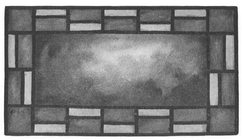 You can make with water-colors an effect very much like stained glass. With pencil, draw an oblong ten inches long and about seven inches wide. Within this, draw another oblong, for the central piece of glass. The size of this inner oblong you must determine for yourself. Remember that its size fixes the width of the border. In the border space, draw some simple straight line design. Paint the smaller oblong, by wetting its surface evenly, and dropping in red, yellow, and blue. Let the colors blend as they will, and use the brush to carry color to the edges of the oblong. When this is dry, paint the shapes in the border in flat washes of any two colors. Last of all, paint strong, black lead lines.