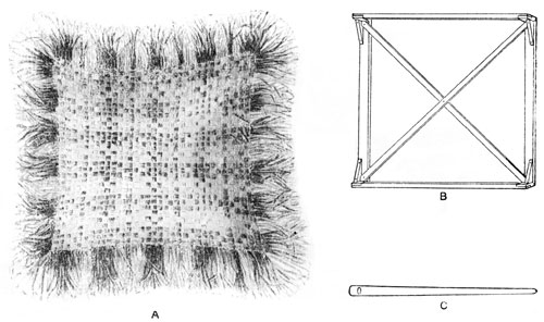 Raffia is an artistic material which lends itself to many uses. The covers for the porch-pillow shown in the sketch on this page are woven with raffia, on a strong loom. The size of the loom determines the size of the woven cover. The cushion from which this sketch was made measured eighteen inches square without the fringe, and about two and a half pounds of raffia were used in the covers, the fringe, and the filling of the cushion. Sketch C shows the wooden needle used in carrying the strands of raffia over and under the warp.