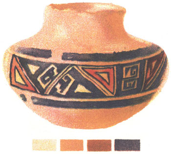 Leaves, plants, flowers, insects, butterflies, shells, feathers, clouds, and countless other objects in nature can furnish us with many delightful color schemes. We can also learn much from the artistic work of people. In Indian pottery and weaving we often see fine combinations of color. The Indians understood how to make beautiful dyes from roots, berries, and other vegetable growths, and the colors obtained in this way have a peculiar quality and beauty, not found in many of the dyes in common use today. The picture on this page is from a fine specimen of Sikyatki pottery. Sikyatki was an Indian village in New Mexico, and was the home of a tribe of Pueblo Indians.