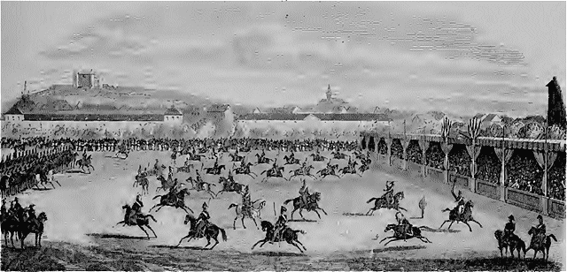 Cinquante officiers, montés sur les magnifiques chevaux du manège, revêtus de riches et élégants uniformes, parurent ensuite. Ils passèrent d'abord devant la princesse, la saluèrent de leurs armes, et exécutèrent, aux trois allures, avec, une grâce et une adresse remarquables, tous les exercices de l'équitation: voiles, courbettes, ballottades, cabrioles, etc., puis le saut de la barrière. En ce moment, deux trompettes parurent à chaque extrémité du Champ-de-Mars; à leur signal apparurent deux escadrons, l'un de lanciers et l'autre de chasseurs; ils se formèrent en bataille, puis exécutèrent diverses manoeuvres et plusieurs charges avec une précision qui ne laissa rien à désirer. Ils se reformèrent aux extrémités du Champ-de-Mars, et les cinquante officiers, qui avaient fait repos, se mirent en mouvement et commencèrent le carrousel.