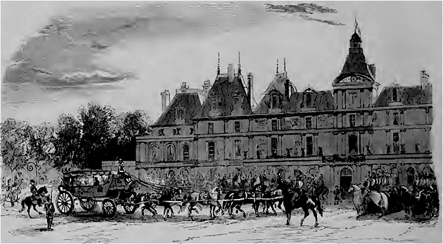 Les tambours et les trompettes annoncèrent enfin l'arrivée du duc et de la duchesse de Nemours, qui prirent place dans une loge réservée, immédiatement après, on fit traverser la carrière par les plus belles juments du haras, puis par un cheval indompté, le Caravant, et par le bel et docile Othon.
