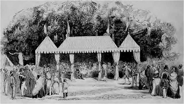 Le 9, de sept à dix heures du matin, le prince visita les bâtiments de l'École, quartiers, écuries, manèges, haras, etc. A trois heures, le carrousel devait avoir lieu; depuis plusieurs heures déjà, les curieux remplissaient le Champ-de-Mars; les tentes préparées pour les spectateurs invités, les débouchés des rues qui donnent sur le Chardonneret, la levée qui borde la Loire, les fenêtres et jusqu'aux toits des maisons voisines, tout était rempli par la foule.
