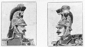 Le casque des officiers est semblable à celui de la troupe, à cette différence près que la bombe est dorée au mercure, et que le cimier, la plaque et la gourmette sont en maillechort.