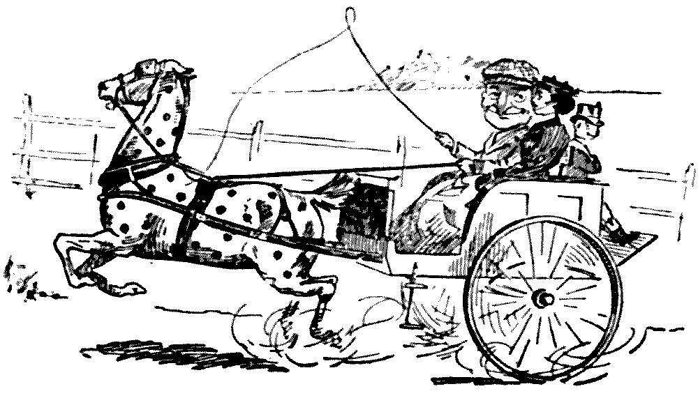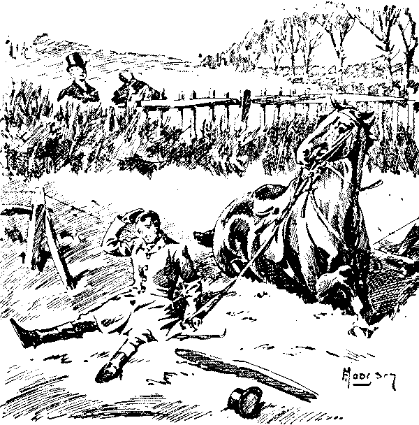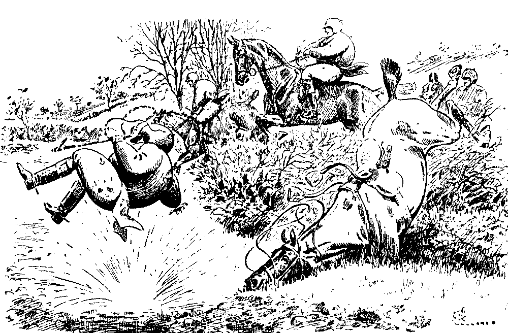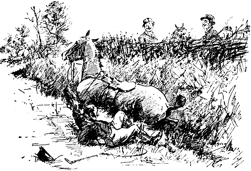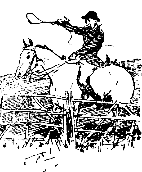 The next moment the starter yelled "Go!" and away, like a whirlwind, we sped across the first field, towards a huge, thick blackthorn fence, the one I had thought to see such fun with. Fun! I never felt less funny in my life, as we approached it at the rate of two thousand miles an hour! The mare jumped high, but I jumped much higher, and seemed for a brief moment to be soaring through the blue empyrean. Somehow, the mare managed to evade me on the return journey earthwards, and, instead of alighting on the saddle, I found myself "sitting on the floor." A howl—it might have been of sympathy, but it didn't sound quite like that—arose from the crowd, and then I thought that I would go home on foot, instead of returning to explain matters to Sir Hercules. As a matter of fact, I don't much care for associating with old Blizzard, at all events, not just now.