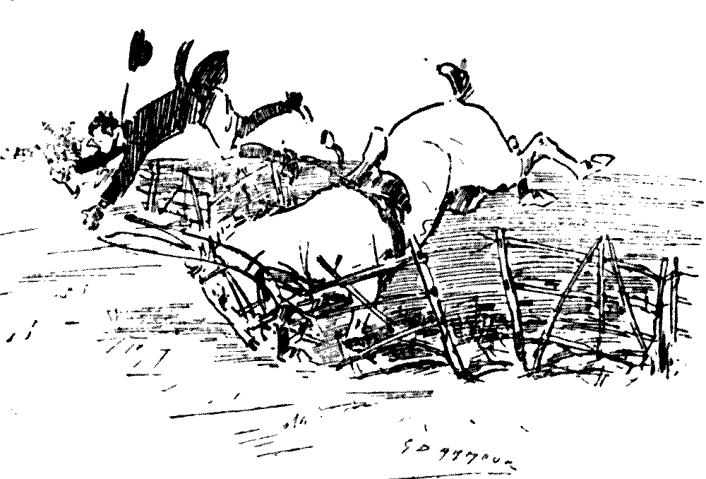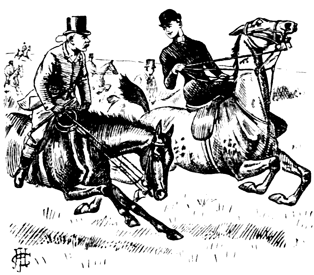 Last week our Point to Point steeplechase came off. So did several of the riders: this merely par parenthèse. I offered to mark out the course, and, as I intended to escape the dread ordeal of riding by scratching my horse at the last moment, I thought it would be great fun to choose a very stiff, not to say bloodthirsty, line. Awful grumbling on the part of those unhappy ones who were to ride. Just as the bell rang for saddling, Captain Sproozer, ready dressed for the fray, came up to me with very long face, and said, "Beastly line this, you know, Phunker. I call it much too stiff."