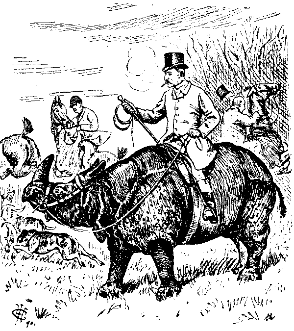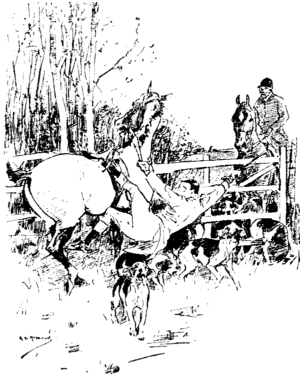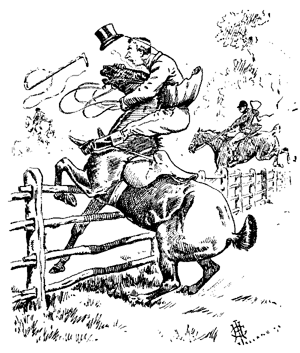 From his earliest days Mr. Punch has been an enthusiast for the Hunting Field. But in this he has only been the faithful recorder of the manners of his countrymen, as there is no sport more redolent of "Merrie England" than that of the Horse and Hound. At no time in Mr. Punch's history has he been without an artist who has specialised in the humours of the hunt. First it was the inimitable Leech, some of whose drawings find a place in the present collection, and then the mantle of the sporting artist would seem to have descended to feminine shoulders, as Miss Bowers (Mrs. Bowers-Edwards) wore it for some ten years after 1866. That lady is also represented in the present work, at pages 49 and 111. Later came Mr. G. H. Jalland, many of whose drawings we have chosen for inclusion here. Perhaps the most popular of his hunting jokes was that of the Frenchman exclaiming, "Stop ze chasse! I tomble, I faloff! Stop ze fox!!!" (see page 141). To-day, of course, it is Mr. G. D. Armour whose pencil is devoted chiefly to illustrating the humorous side of hunting; but now, as formerly, most of the eminent artists whose work lies usually in other fields, delight at times to find a subject associated with the hunt. Thus we are able to present examples of Mr. Cecil Aldin and Mr. Raven-Hill in sportive mood, while such celebrities of the past as Randolph Caldecott and Phil May are here drawn upon for the enriching of this, the first book of hunting humour compiled from the abundant chronicles of Mr. Punch.