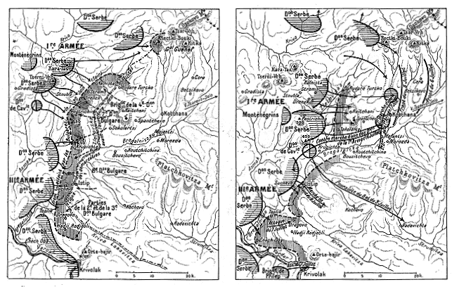 » Tout l'intérêt de la bataille se portait donc à ce moment à notre aile droite où il devenait absolument nécessaire d'assurer le succès de la marche en avant de la IIIe armée. Une brigade hâtivement ramenée de Prilep vint soutenir notre division d'extrême droite et, concurremment avec elle, reprit l'offensive dans la direction de Krivolak. Enfin, le 5 juillet, la Ire armée ayant réussi à mettre la main sur Kotchana, puis, le lendemain 6, à établir ses avant-gardes sur les crêtes de Cera et de Betsikovo, le prince Alexandre décida de distraire une de ses divisions et de l'envoyer vers le sud appuyer, dans la direction d'Istip, l'attaque générale de la IIIe armée.