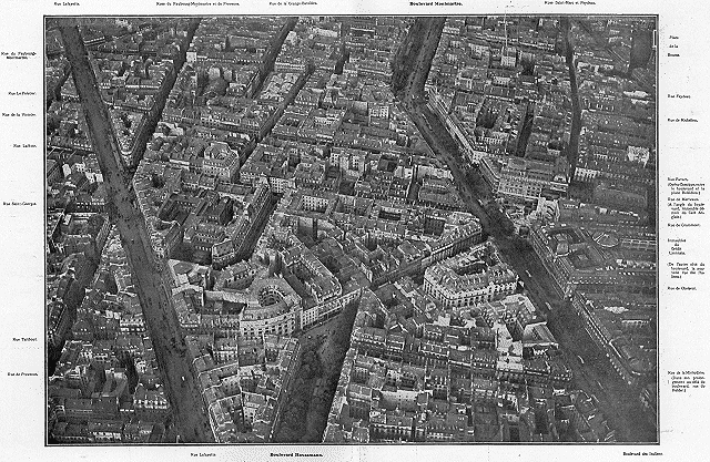 A diverses reprises nous avons entretenu nos lecteurs du projet d'achèvement du boulevard Haussmann; nous avons, notamment, indiqué la combinaison financière agréée par le Conseil municipal et nous avons donné un plan détaillé montrant le périmètre des immeubles à exproprier et les alignements de la voie future. La photographie, prise en dirigeable, que nous publions d'autre part achève de fixer les idées; mieux que le plus précis des plans, elle montre, tel qu'il se présente aujourd'hui, le groupe d'immeubles à abattre entre le terminus actuel du boulevard Haussmann et le boulevard Montmartre.