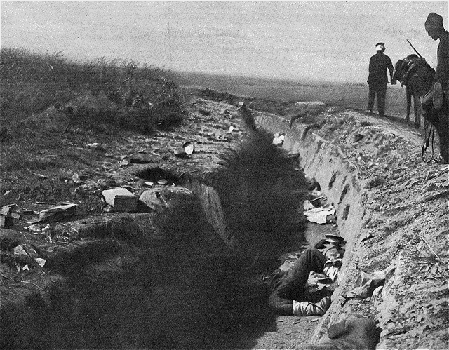 Sur le haut des crêtes du Drenek, nous trouvons en quantités énormes des étuis de cartouches et des chargeurs bulgares, un peu plus loin un amas de douilles de pièces d'artillerie. Je n'exagère pas en estimant à environ 200 au mètre courant le nombre d'étuis trouvés sur la position, des tirailleurs ennemis. L'on jugera par là de l'intensité du feu et l'on s'expliquera les énormes pertes subies.
