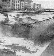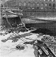 ![]() Après la chute du pont: seule la dernière pile émerge, tandis que les rails du tramway, les câbles électriques et les conduites d'eau relient toujours les deux rives.--Phot. Thuret. |