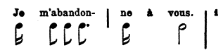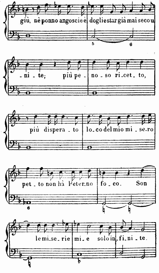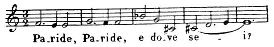 La musique en a disparu; mais les spectacles populaires, parallèles à ces représentations bourgeoises et aristocratiques, les Mai de la campagne toscane, qui se sont conservés depuis le XVe siècle jusqu’à nos jours, avec peu de changements, nous fournissent encore des indications précises sur ce que devait être ce chant primitif au théâtre. Le Mai est en stances de quatre vers de huit syllabes, rimant le premier avec le quatrième, le second avec le troisième. La musique est une cantilène perpétuelle avec quelques trilles et ornements vocaux. Le chant est lent, uniforme, d’ordinaire sans accompagnement instrumental, parfois pourtant avec violon et contrebasse. Il est dans la tonalité majeure. Le rythme est marqué par l’accentuation de la première note de chaque mesure, qui correspond à la troisième et à la septième syllabe de chaque vers. En voici un exemple, que M. Alessandro d’Ancona a eu l’obligeance de me communiquer: