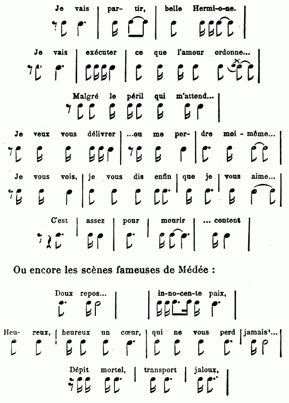 [471] Lorsque Andromaque récite (dans l’opéra du même nom), elle est presque toujours accompagnée de trois flûtes traversières qui forment harmonie... C’est, je crois, la première fois qu’on a eu l’idée d’adopter les mêmes instruments pour accompagner partout le récitatif d’un rôle qu’on veut distinguer.» (Ibid., I, 356.)