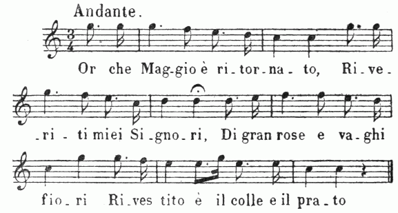Cette cantilène est répétée pour les strophes suivantes; mais les chanteurs ont coutume d’y introduire des passages de bravoure, qui en modifient un peu la monotonie. Ce genre d’air se reproduisait de Mai en Mai, d’une façon si traditionnelle qu’on voit souvent marqué sur le texte de ces pièces campagnardes: Da cantarsi sull’aria del Maggio (A chanter sur l’air du Mai).