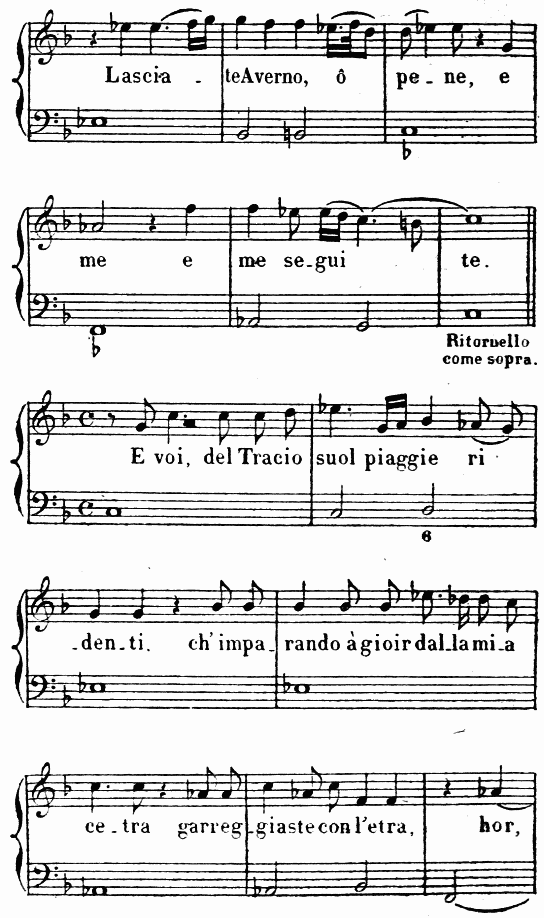 On sait que les premiers essais de l’opéra florentin à la fin du XVIe siècle, repris et consacrés au commencement du XVIIe par le génie de Monteverde, furent deux pastorales en musique: une Dafne, traitée successivement, de 1594 à 1608, par Corsi, Peri, Caccini et Marco da Gagliano; et une Euridice (ou un Orfeo), traités tour à tour, de 1600 à 1607, par Peri, Caccini, Monteverde, et, un peu plus tard, par Stefano Landi (1619) et Luigi Rossi (1647).